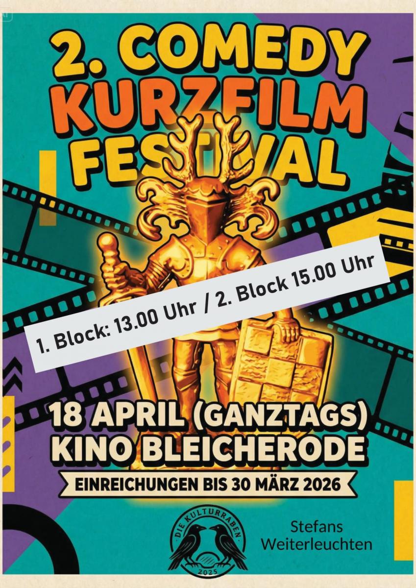 Wir freuen uns auf eure zahlreiche Teilnahme, ob als Besucher oder Filmemacher und wünschen uns allen viel Spaß beim ?2. Bleicheröder Comedy Kurzfilm Festival? im Filmtheater Bleicherode.